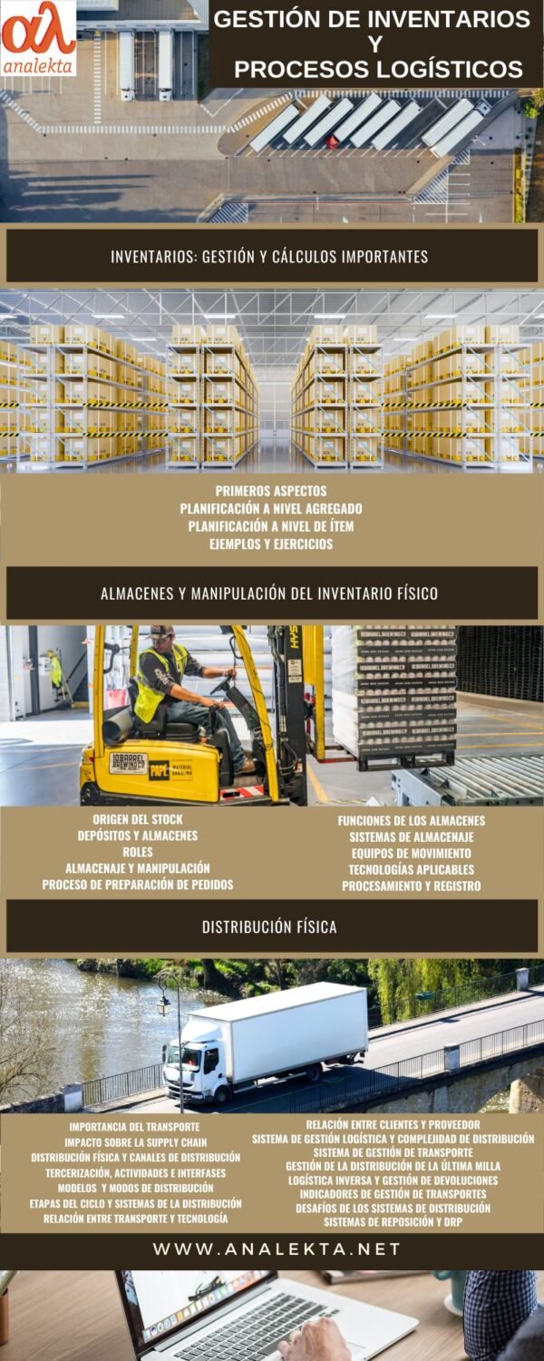 Los inventarios son el timón para el rumbo operativo y financiero de las operaciones. Impactan en empresas productoras de bienes y de servicios. Siempre influyen en la cuenta de resultados. Los almacenes tienen importancia crítica en la configuración de la distribución. Junto al transporte determinan la eficiencia y resultado económico de la operación. Esta especialización está enfocada en los tres procesos logísticos que componen las operaciones de cualquier empresa que vende productos: gestión y planificación de los inventarios físicos; gestión de los almacenes; y gestión de la distribución física y transporte de los bienes.