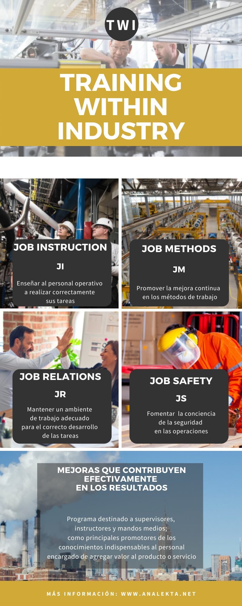 Conocer el contexto del TWI en cuanto al antecedente y las bases que sentaron su consolidación. Identificar los componentes del TWI y el impacto de su implementación. Distinguir los objetivos, resultados y pasos de cada componente del TWI. Reconocer los desafíos y elementos implícitos en la implementación del TWI.